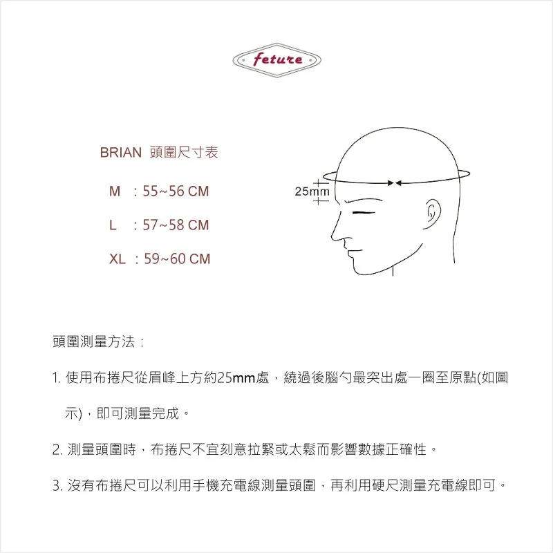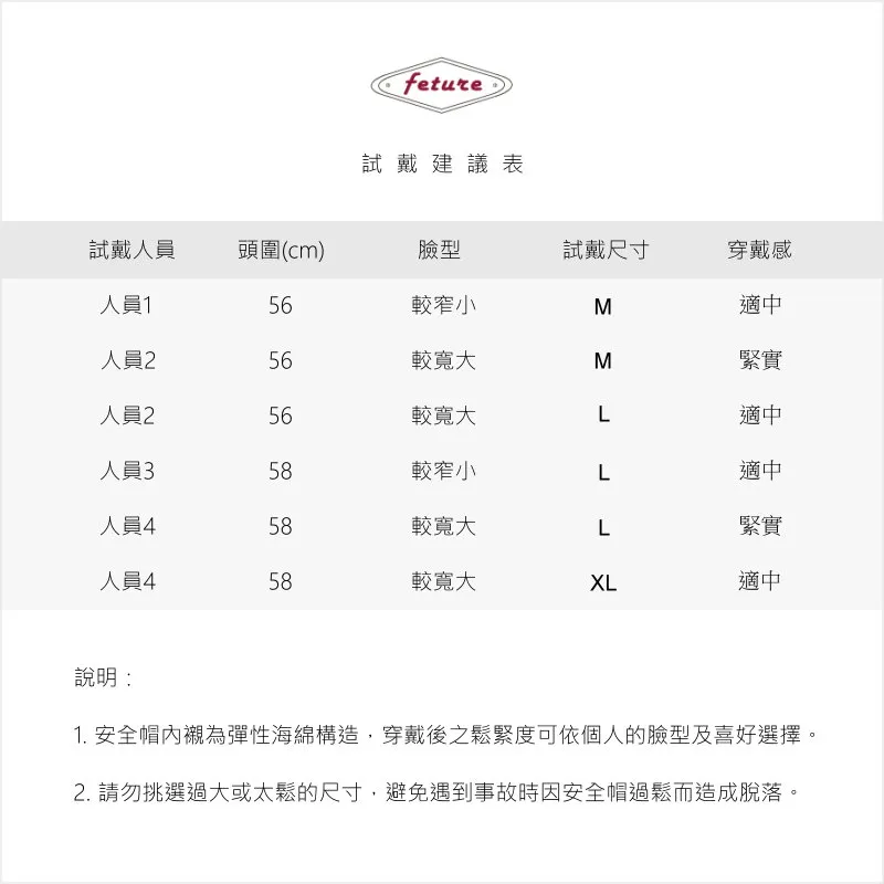 頭圍尺寸:M (55-56cm)、L (57-58cm)、XL (59-60cm),選購前請參考以下頭圍尺寸建議圖表。