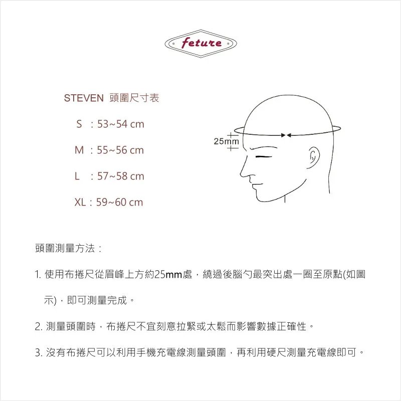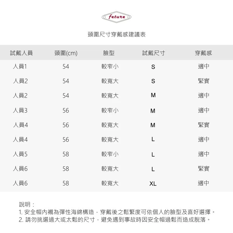 頭圍尺寸:S (53-54cm)、M (55-56cm)、L (57-58cm)、XL (59-60cm),選購前請參考以下頭圍尺寸建議圖表。